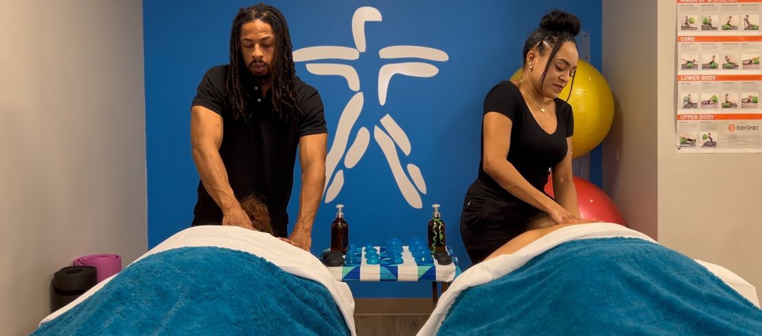 Deep-tissue massage for two on a massage table full of Rose Petals. Enjoy a hot stone add-on or cupping, hot towel, complimentary wine or water & chocolates.